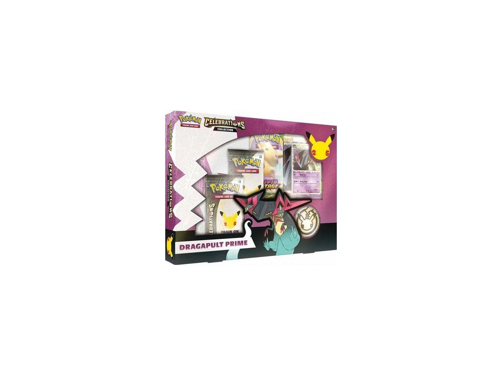 Celebrations Collection Dragapult Prime je prémiové balení, ve kterém naleznete foilovou promo kartu Dragapult PRIME, obří Jumbo kartu Dragapulta PRIME, házecí minci, album na karty A5 a doplňkové Booster balíčky.