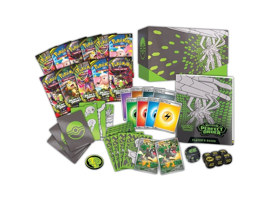 Elite Trainer Box Perfect Order je balení 9 balíčků Pokémon karet, 1 promo kartu Tyrunt, 65 obalů, 6 kostek a oddělovačů. Každý balíček obsahuje 10 karet.