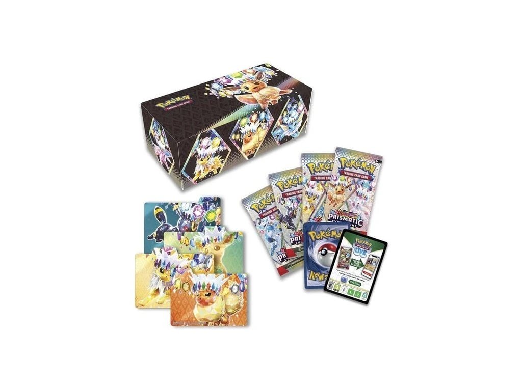 Prismatic Evolutions Surprise Box je balení 4 boosterů edice Prismatic Evolutions, jednu náhodnou kartu Eevee evoluce a rozdělovači mezi karty.