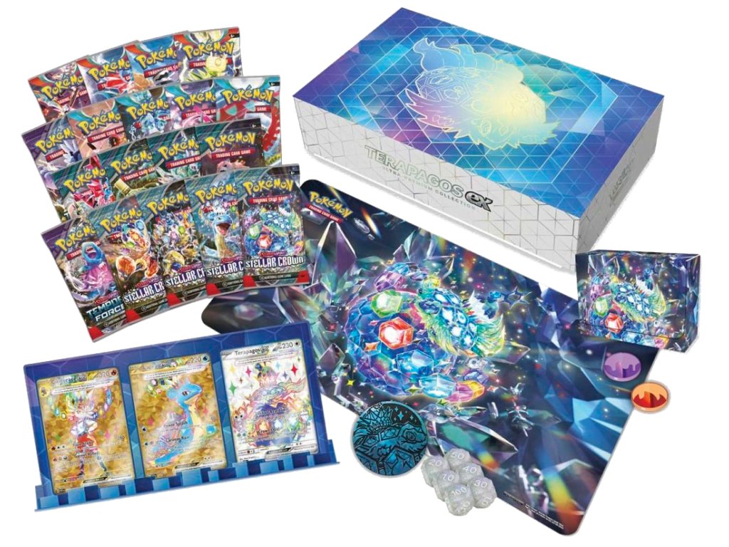 Pokémon Terapagos Ultra Premium Collection je speciální box obsahující 18 balíčků různých edic, stojánek na 3 karty, 3 promo karty , podložku, krabičku, kostky a minci.